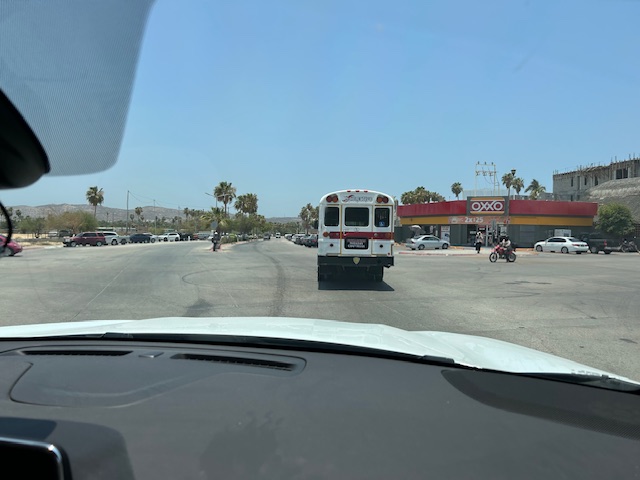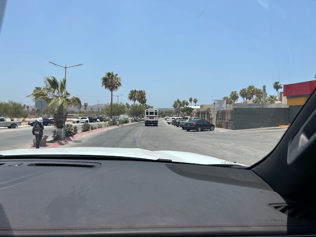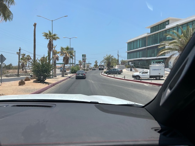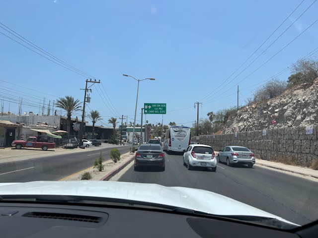 You will pass the road to Flora Farms on the left. Keep going – this is the east cape road. Follow it until you get to another glorieta – here you would turn right to get to El Encanto and you would go straight to get to Zacatitos. (In the past google maps has incorrectly showed turning right here – DON’T.